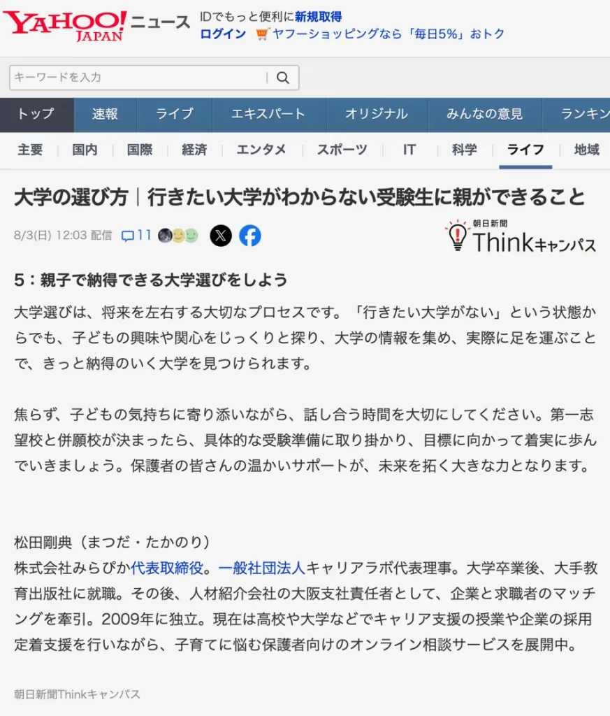 2025年8月3日「朝日新聞Thinkキャンパス」にて、弊社代表松田の行きたい大学がわからない受験生の保護者向けの記事が公開されました。本記事では、大学選びの重要性や、選び方のポイント、保護者ができるサポートについて分かりやすく紹介しています。